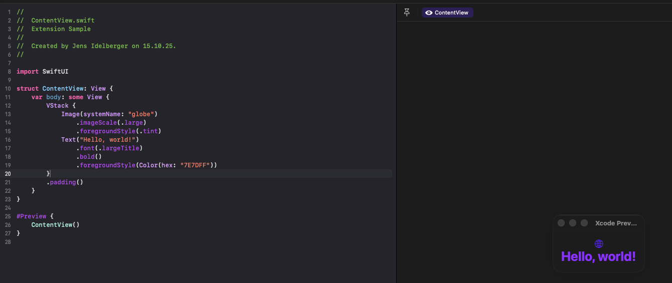 In der Extension wird ein neuer Initializer eingeführt, der als Parameter einen hexadezimalen String nutzt. Der String wird mit der Scanner-Klasse gescannt und in einen Integerwert überführt. Dann wird diese Integerwert bitweise in die drei RGB-Werte überführt und dann der klassische Initializer übergeben.